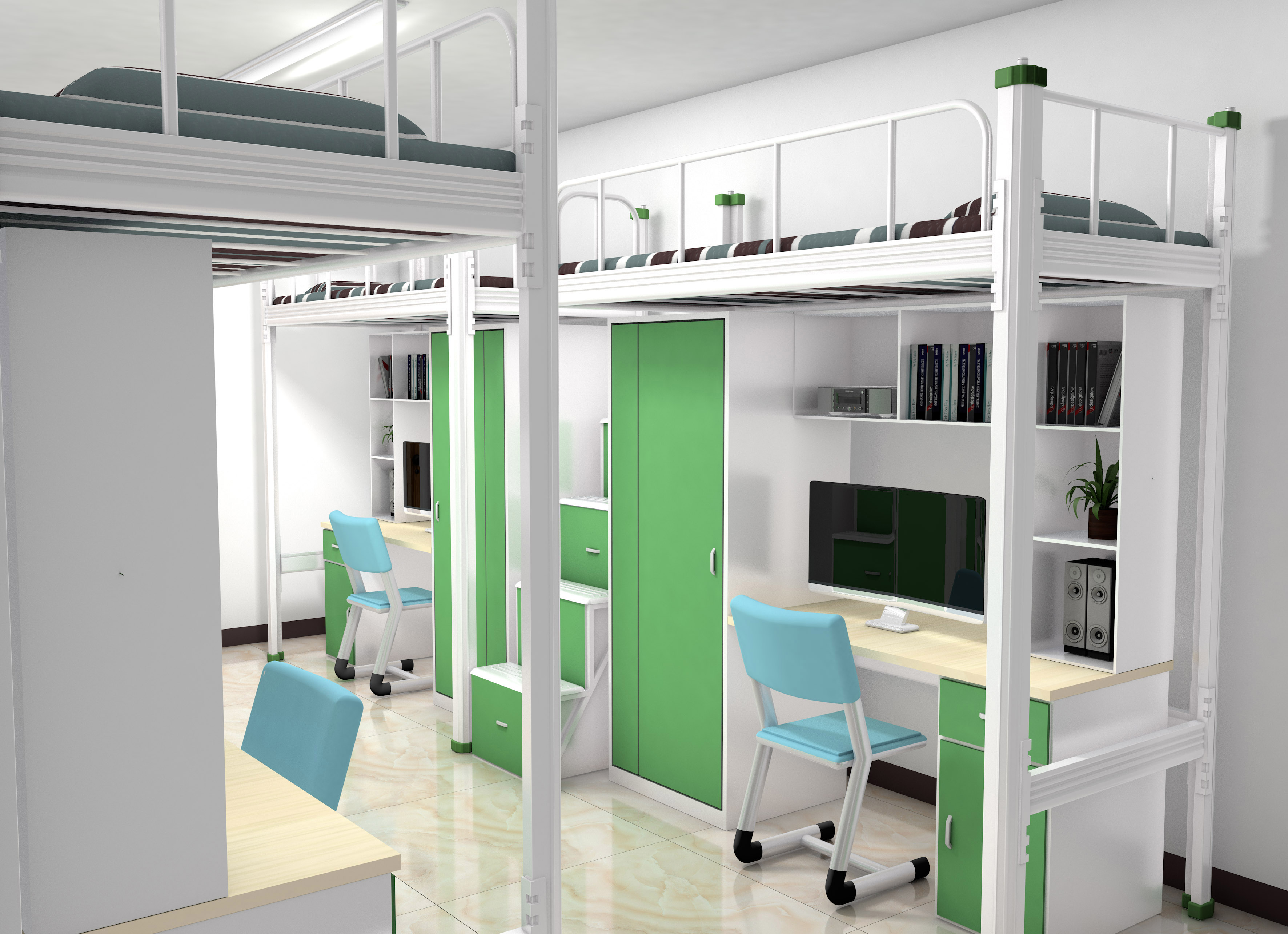 如果宿舍空间和预算有限,可以选择上下铺的铁床,这种型材铁床,四卡扣设计,坚固稳定不异响,而且非常安全。