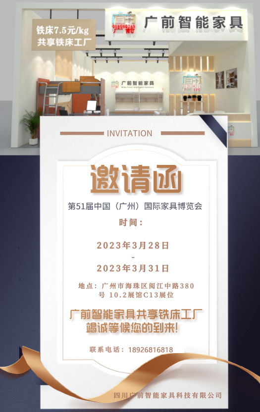 【概要描述】2023年3.28号-3月31号 第51届中国(广州)国际家具博览会在广州琶州举行,广前智能家具诚挚邀请你莅临参观指导 我们的展位是10.2号馆C13号,广州,不见不散吧! 我们会正式向大家公布我们共享铁床工厂合伙人模式的细节,还有我们一分钟生产一张铁床,而且品质更稳固的生产工艺 先进的设备,和铁床行业新品,铁床行业资讯,欢迎你来!