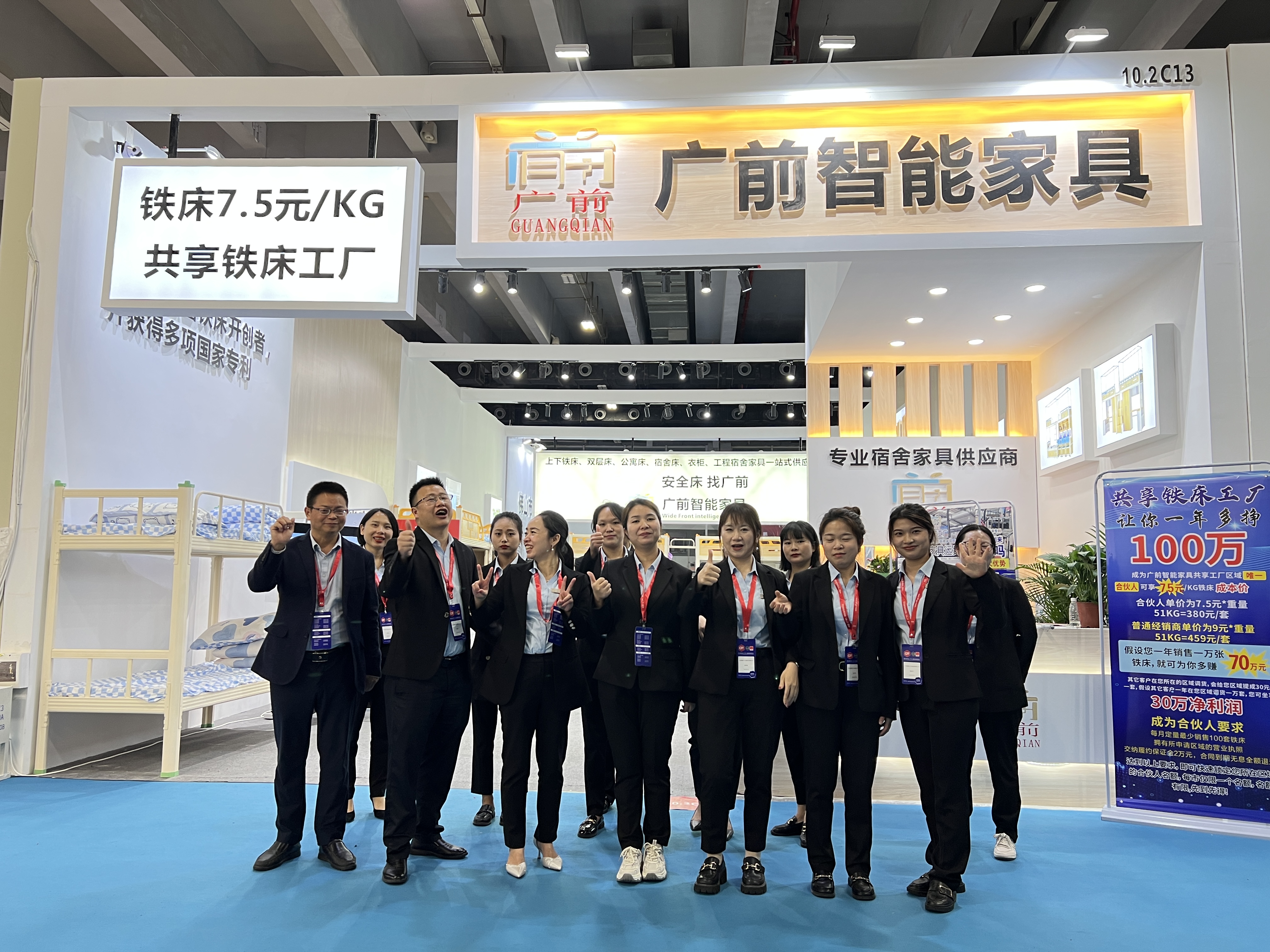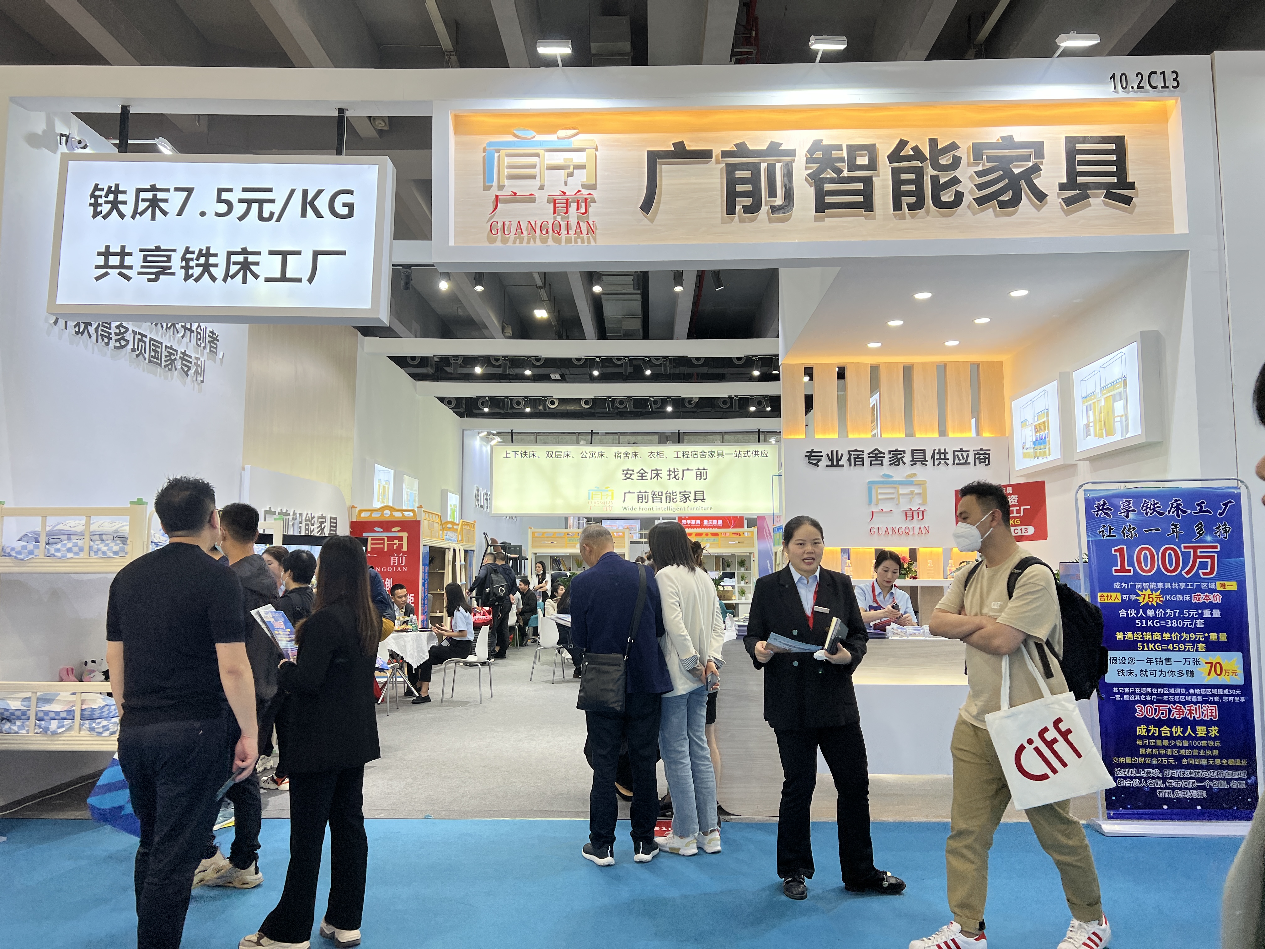 【概要描述】为期四天的第51届广州家具展,在广州琶州完美落幕,这是疫情开放以来的第一次广州展会,现场人潮如涌, 广前智能家具在这里的展会上可谓是大放异彩 7.5元/KG的铁床成为10.2号铁床馆的地标展馆,共享铁床工厂合伙人模式也得到了很多铁床企业和项目人的认可 让我们来看看展会上的精彩时刻! 接下来我们会在四川广安等你,来共享铁床工厂一起探讨铁床企业的发展之路!