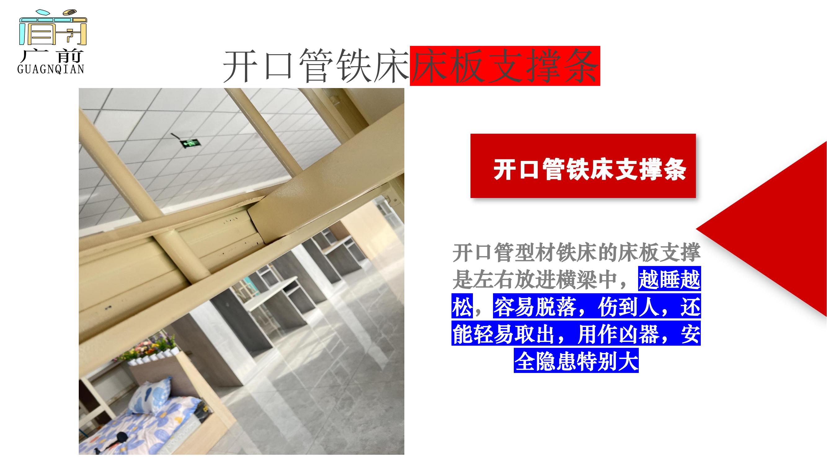 【概要描述】 图片中的学生宿舍公寓,是广州某个项目,因为这次项目采购了一批开口管的型材铁床,导致铁床掉漆和变形,学校直接验收不合格,将铁床扔到楼下。 这对铁床工厂造成的损失是不可估量的,直接导致工厂破产,所有铁床工厂要引以为戒! 广前智能家具将安全铁床贯彻到底,所以我们的闭口型材铁床在学校项目不可能受到这种待遇! 广前智能家具共享铁床工厂欢迎大家来工厂参观!