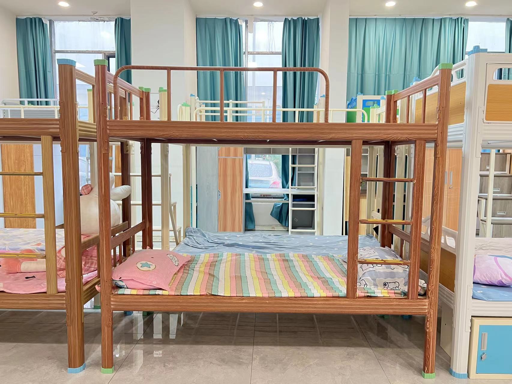 既有木床的外观,又有铁床坚固耐用的特质,是非常不错的一款宿舍用的上下铺铁床。