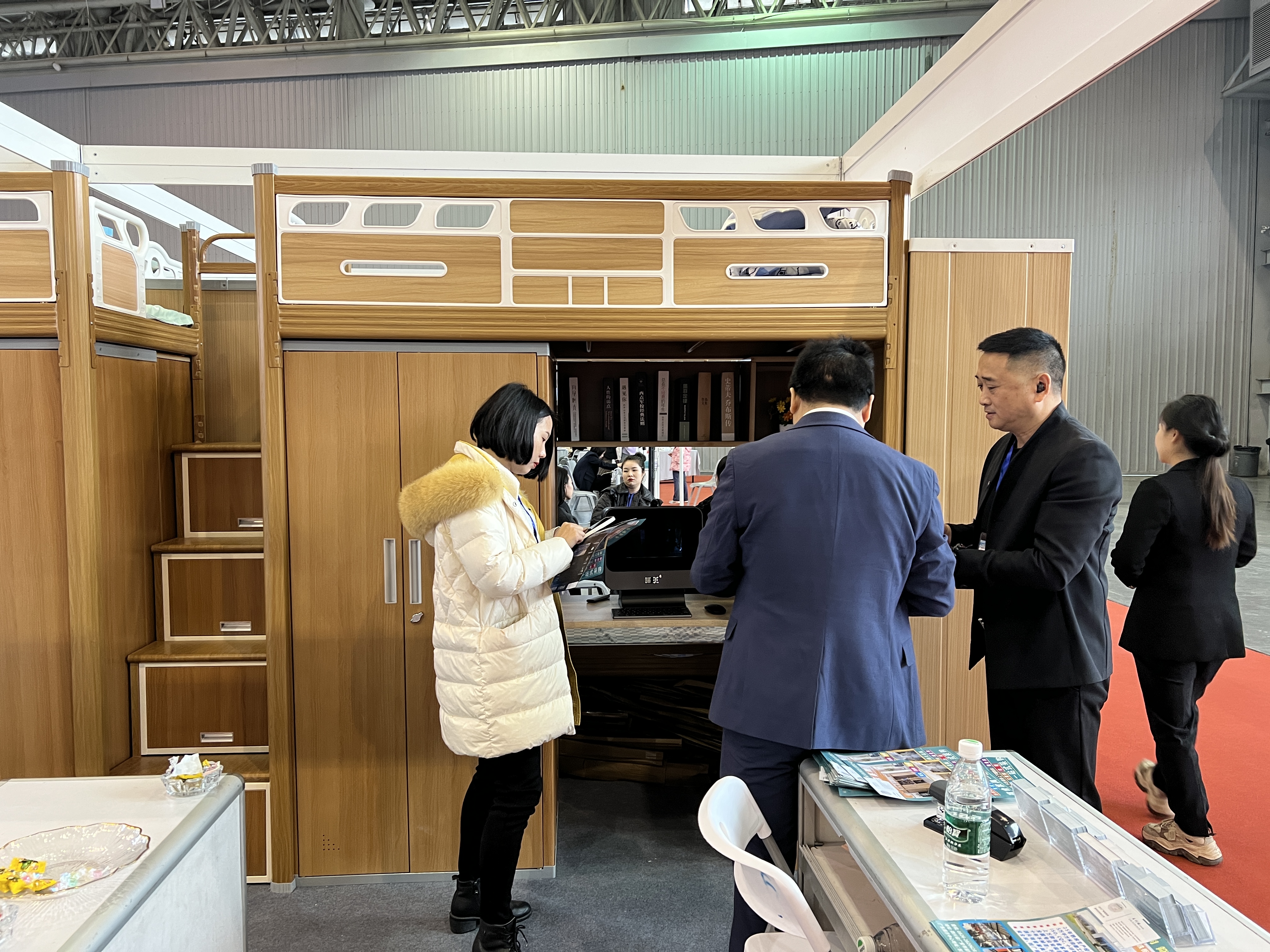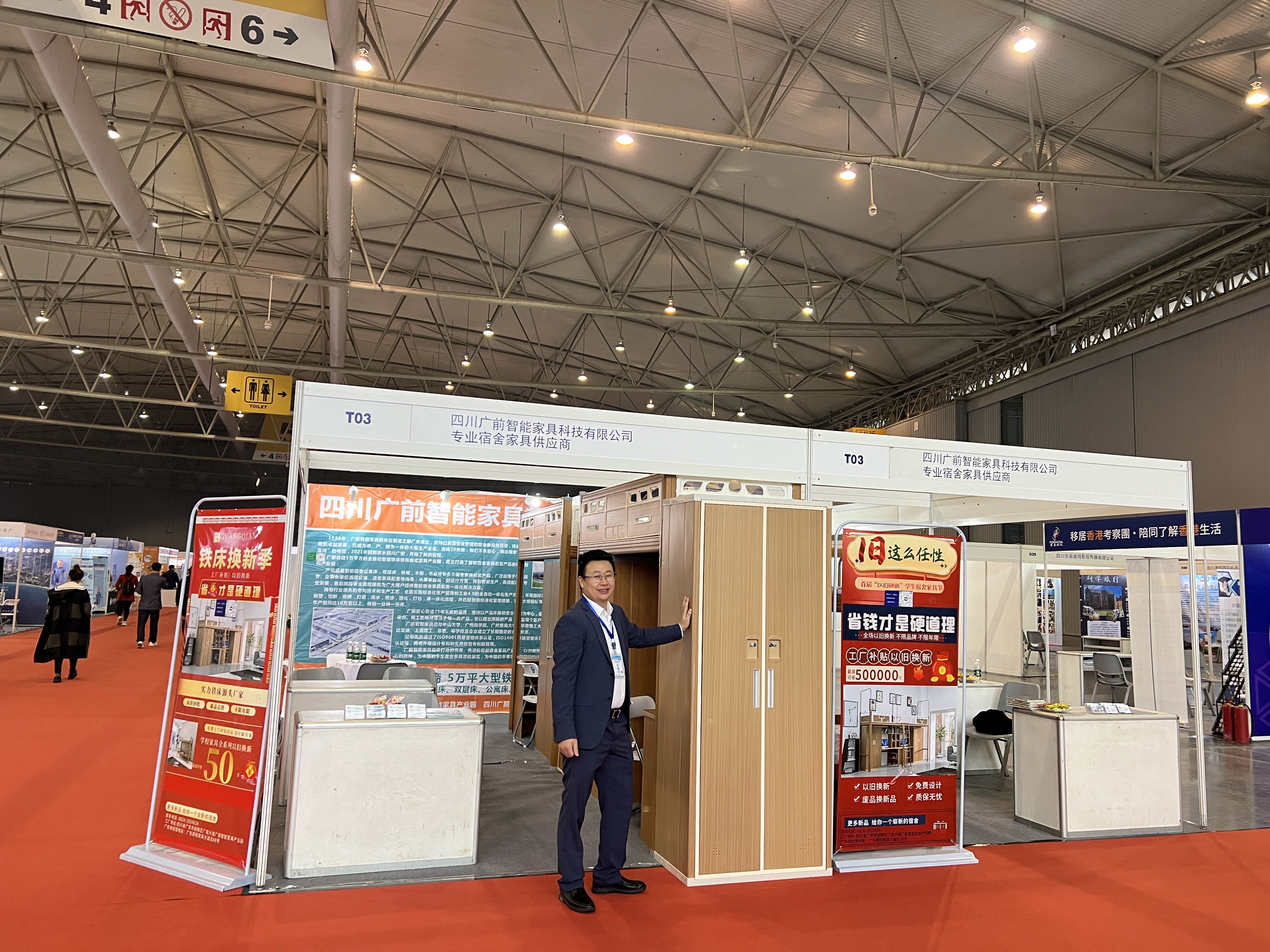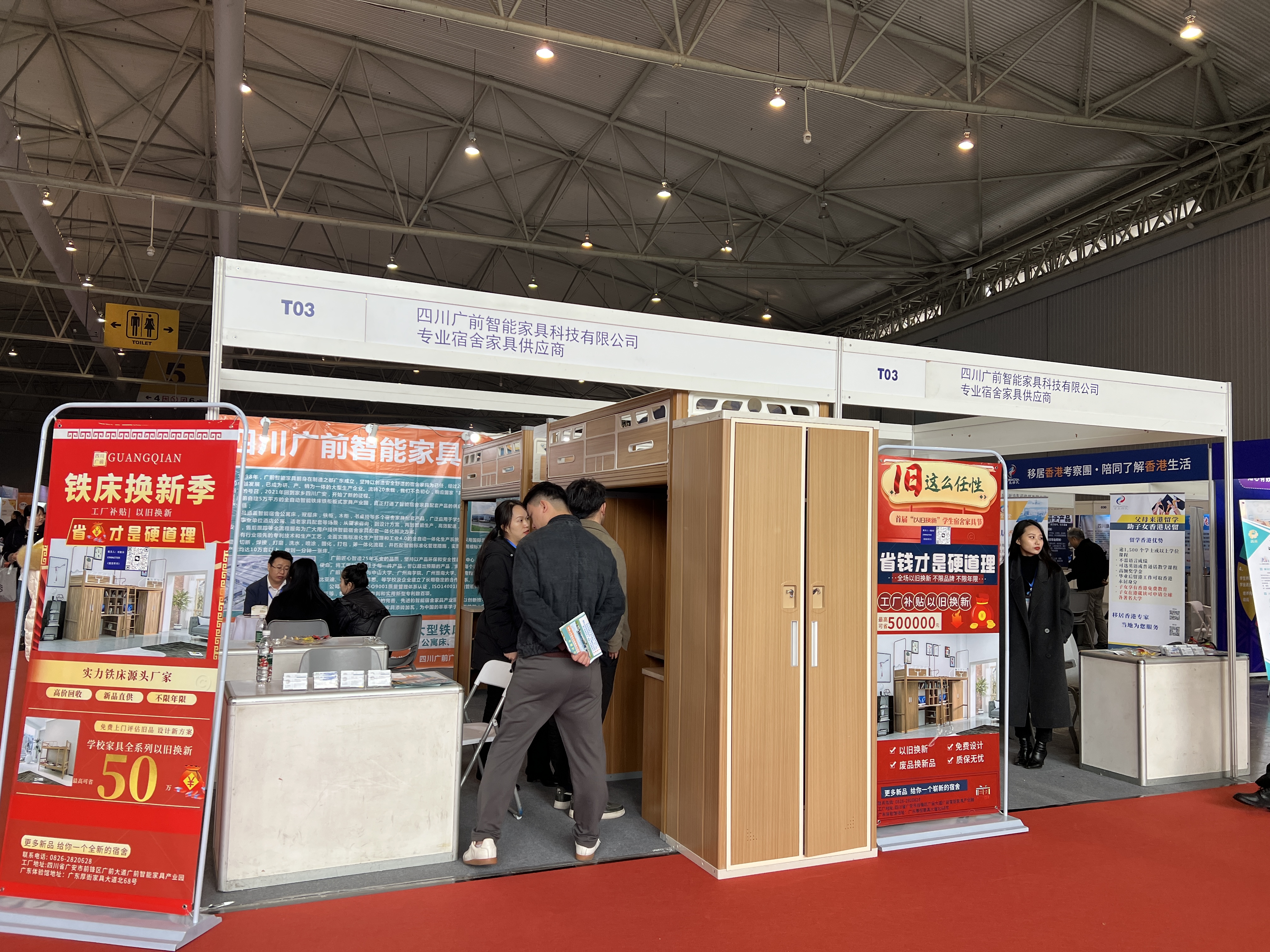 【概要描述】2023年11月,四川广前智能家具科技有限公司参加了中国西部教育博览会,在展会上大展风采! 广前智能家具这次的参展样品可谓也是震撼全场,木纹铁床问世,还有木纹上床下桌公寓床,全木纹转印的 四门铁柜,两门衣柜等,让现场观众大饱眼福! 2024年的学校宿舍家具,木纹转印的宿舍床将会大放异彩 广前智能家具为中国的教育事业添砖加瓦!